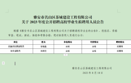 雅安市名山區(qū)茶城建設(shè)工程有限公司系雅安市名山區(qū)區(qū)屬一級國有企業(yè),成立于2018年10月,注冊資本金25000萬元,主要經(jīng)營范圍為對土地、城市資源等領(lǐng)域及保障性住房、房地產(chǎn)開發(fā)、城市基礎(chǔ)設(shè)施、公共服務(wù)設(shè)施等進(jìn)行經(jīng)營管理;并開展項(xiàng)目投資、工程管理服務(wù)、園林綠化、環(huán)境治理工程、土地整理和各類工程建設(shè)活動等。根據(jù)公司2023年人員招聘計(jì)劃,茶城公司擬面向社會公開招聘3名工作人員。現(xiàn)將有關(guān)事項(xiàng)公告如下:一、報(bào)名條件(一)招錄崗位、名額及招錄資格條件(見附表)(二)基本條件1.本科及以上學(xué)歷、學(xué)士及以上學(xué)位。包括2023年應(yīng)屆高校畢業(yè)生;2022年、2021年未參加工...